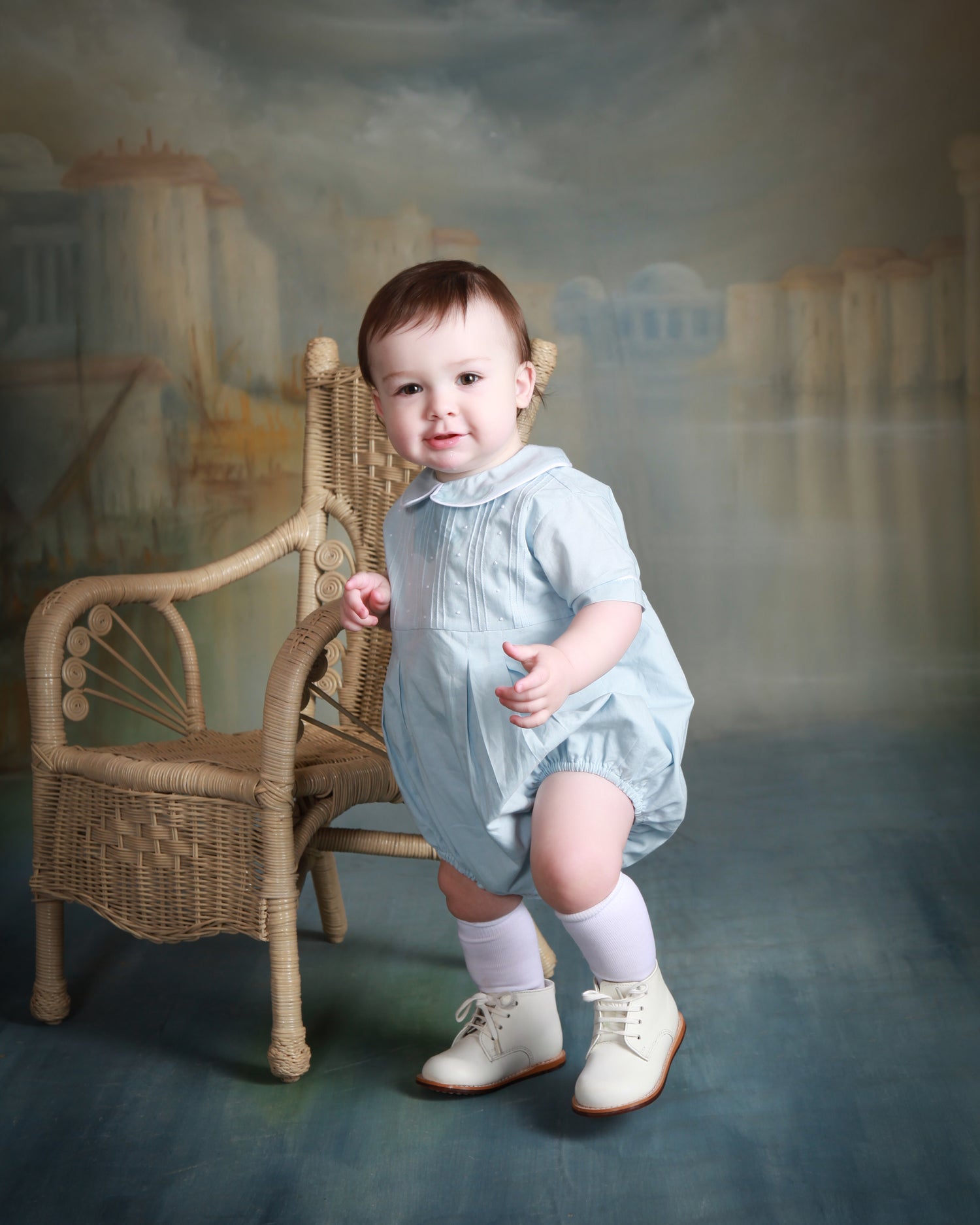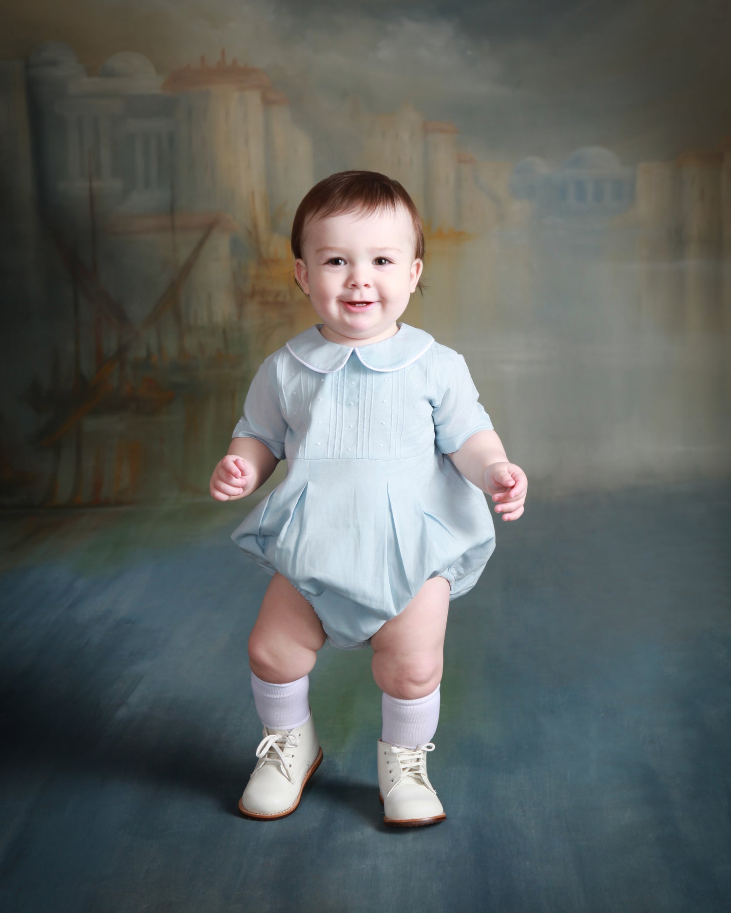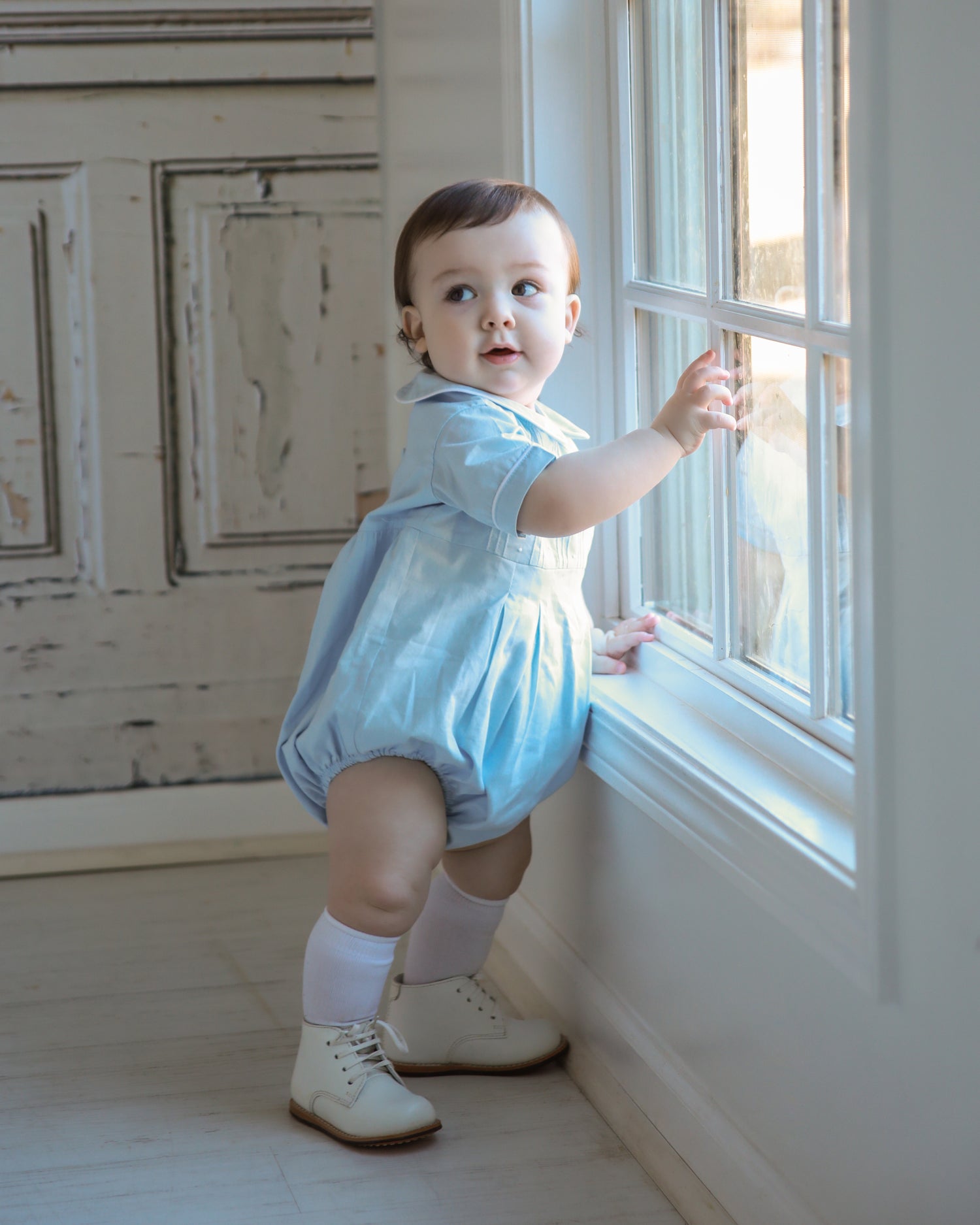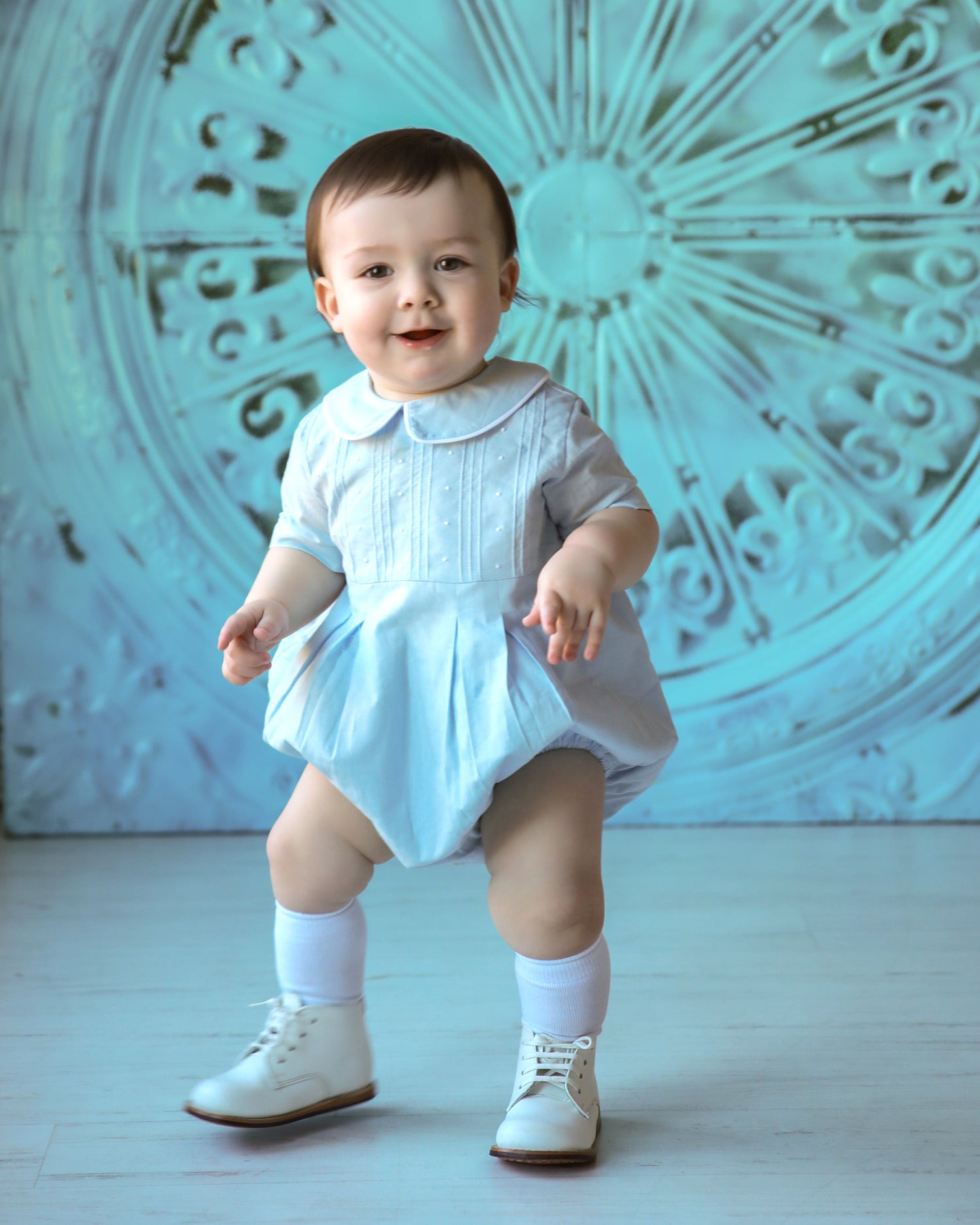 Our 100% cotton short sleeve bubble has darling pintucks and hand-embroidered French knots on the chest. Fabric-covered buttons in the back and a button crotch make dressing easier. A Peter Pan collar will frame his sweet face and is the perfect spot for a monogram to personalize this heirloom design. Full lining in 100% cotton and covered French seams assure softness against his tender skin. Coordinate with our Savannah and Molly dresses for portraits and celebrations.