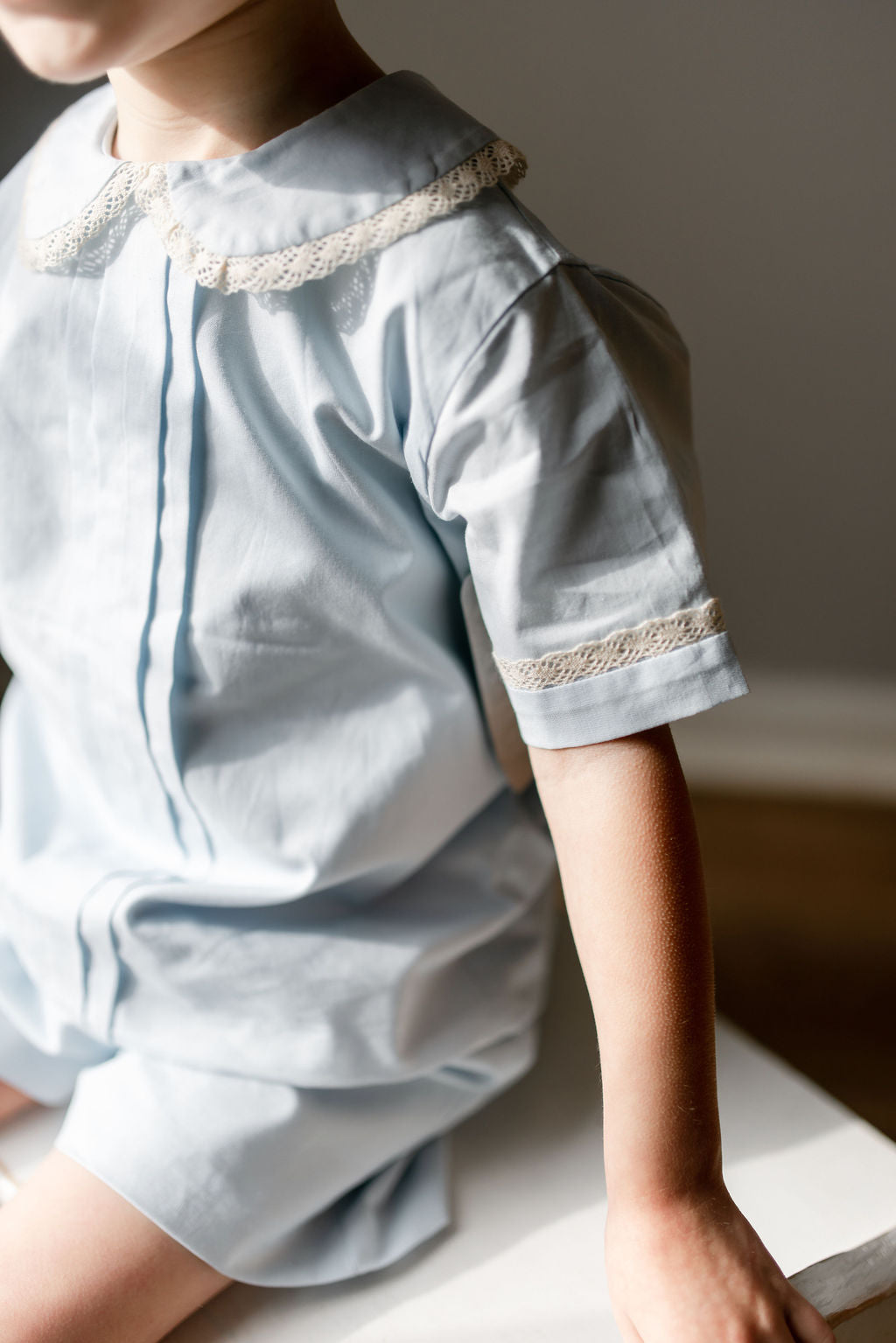 The classic combination of light blue fabric and ivory lace comes together in our newest short set for boys! In soft 100% cotton, this two-piece set has elegant tucks and ivory buttons on the shirt. The shorts have a finished front waistband with back-elastic for comfort. Designed to wear with the shirt out or tucked in, the set has French seams, fabric-covered buttons, and is lined in 100% cotton. The cotton lace that accents the collar and sleeves coordinates with our Savannah dress for darling sibling portraits and wedding parties.