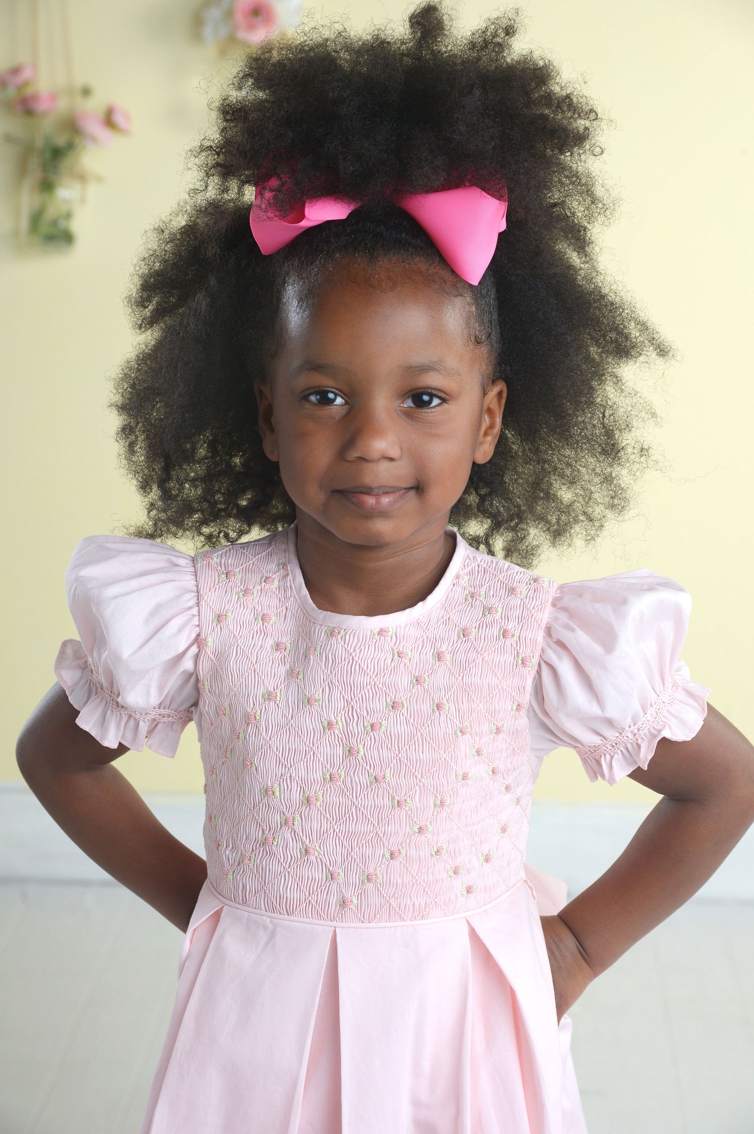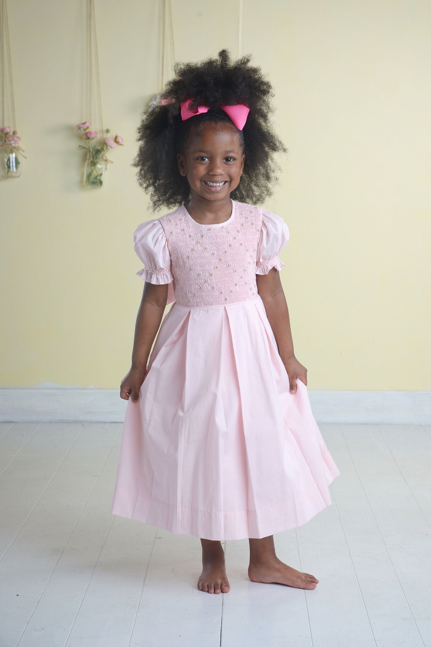 This classic design is back in our collection! Addison features delicate hand embroidered rosette flowers that accent the lattice embroidery pattern on the smocked bodice. A box pleated skirt makes this dress hang beautifully for a unique look. Gathered sleeves with embroidery give it that adorable southern look. Made of pink 100% cotton and fully lined in 100% Cotton making no slip necessary. Sash ties in back. This dress makes the perfect princess gift your little one is sure to love! A beauty for birthdays!