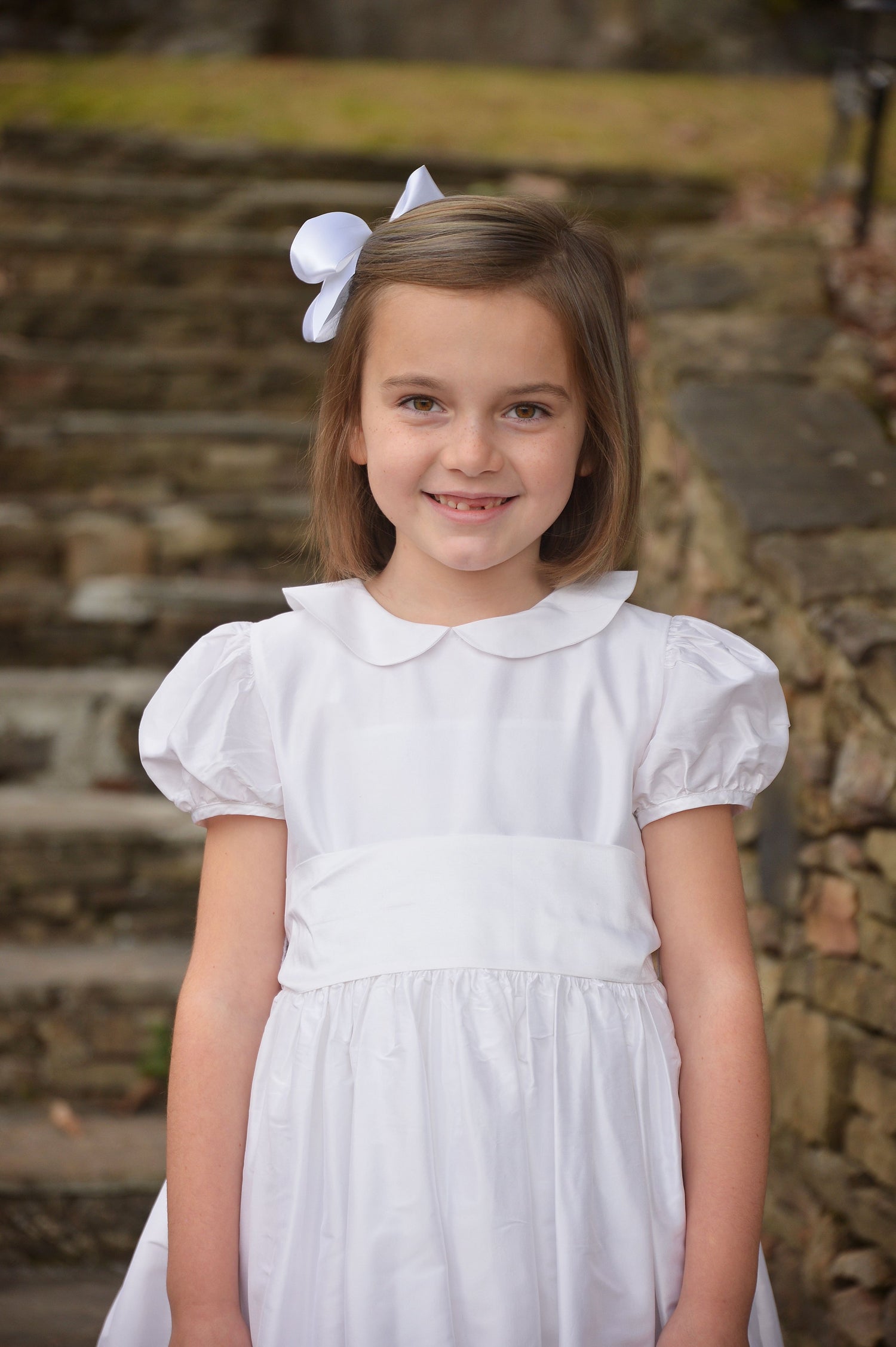 Audrey is an iconic 100% silk dupioni white dress with a round collar, fabric-covered buttons, and silk sash that ties in a beautiful bow. The lining includes a tulle underskirt for a full, twirling skirt. This timeless design can be worn for holidays, First Communion, flower girls, portraits, and more! Fits mid-calf length, true to size. Remove the sash to add a darling monogram or change the look with a different color sash to coordinate with your event. The soft white silk color coordinates with a range of white and ivory shades.