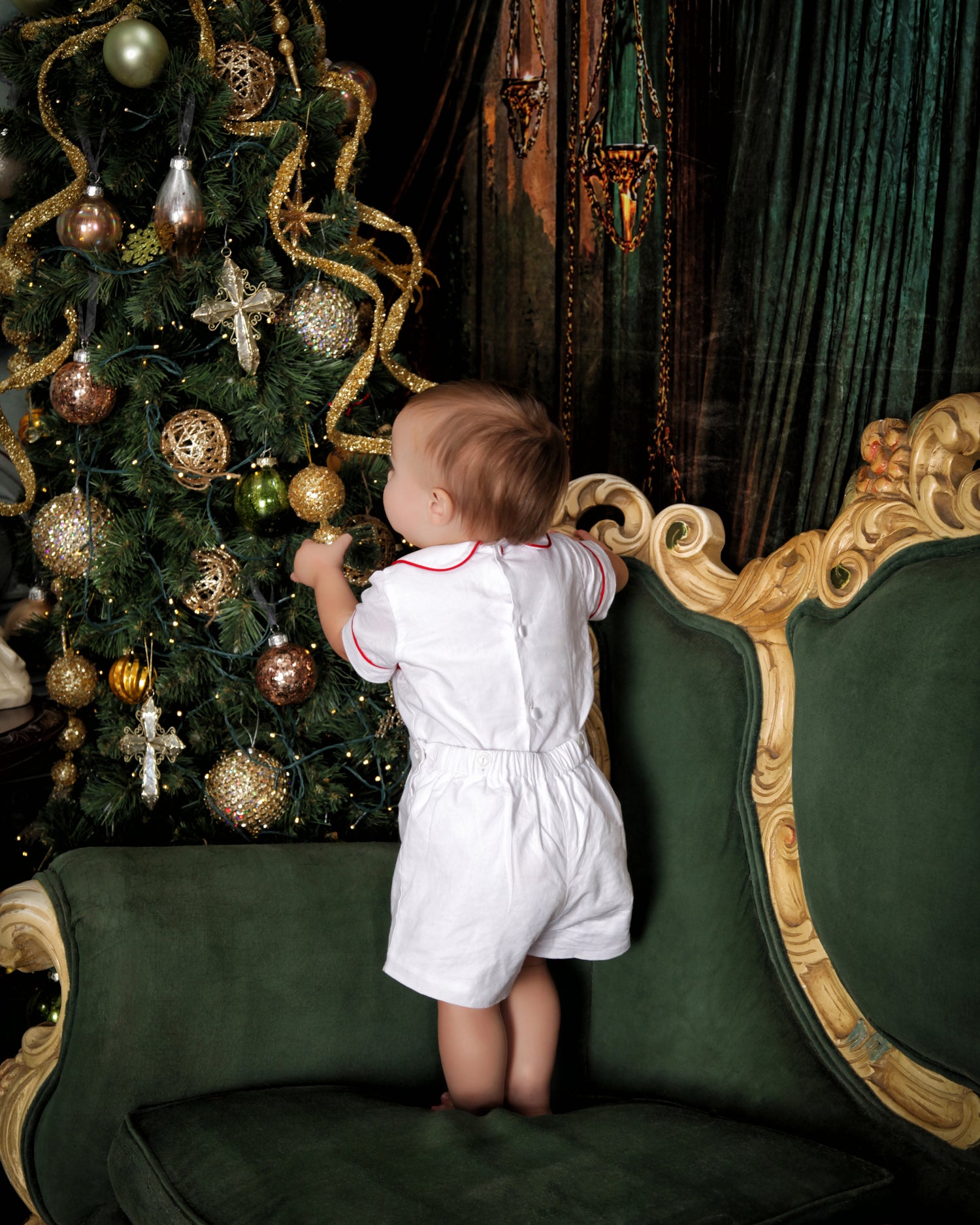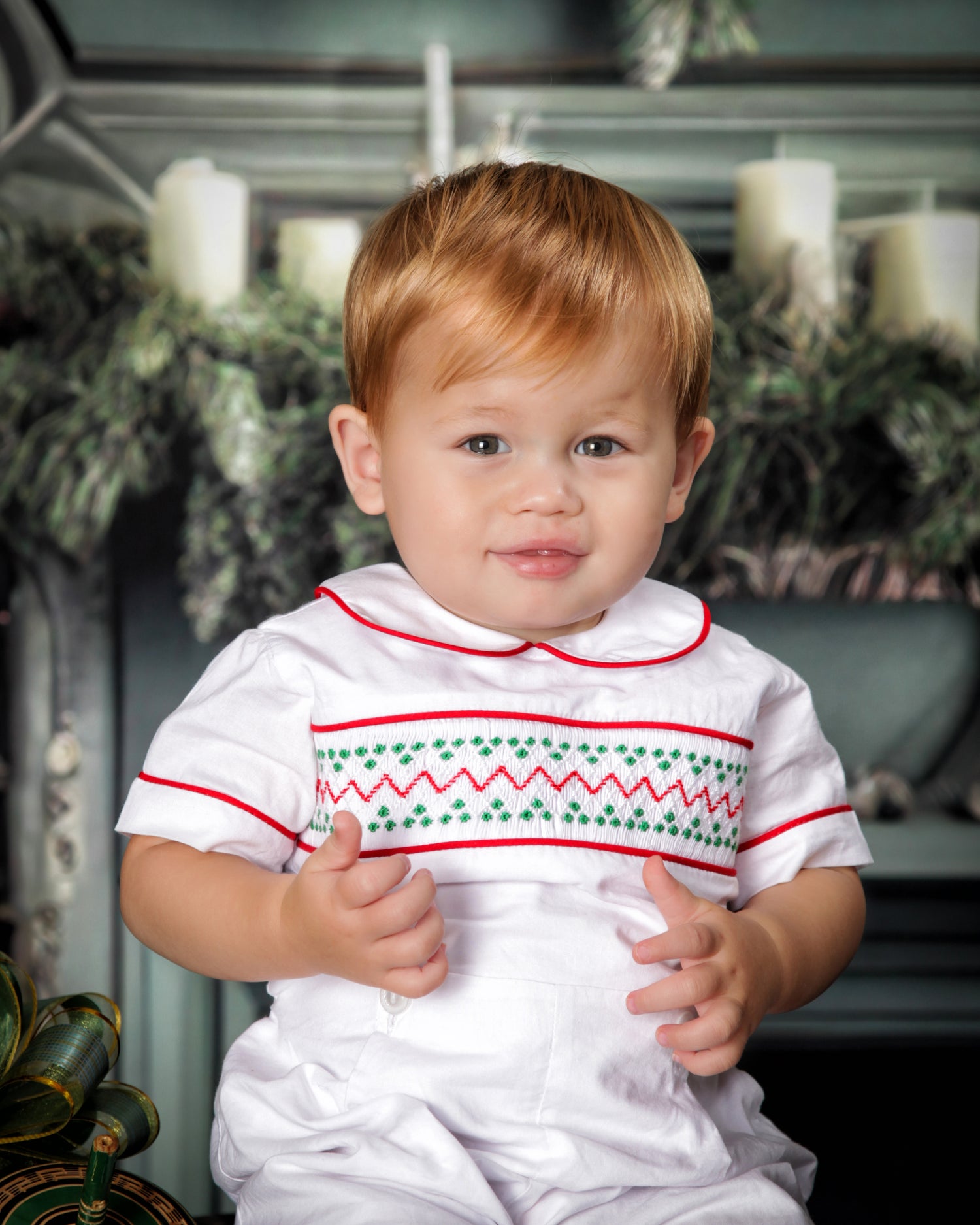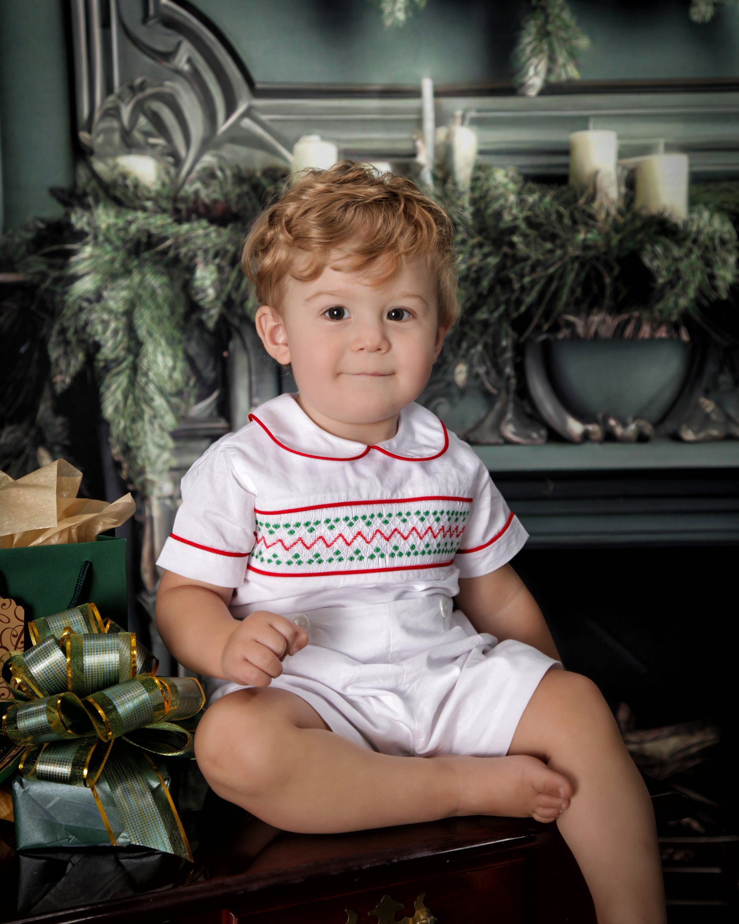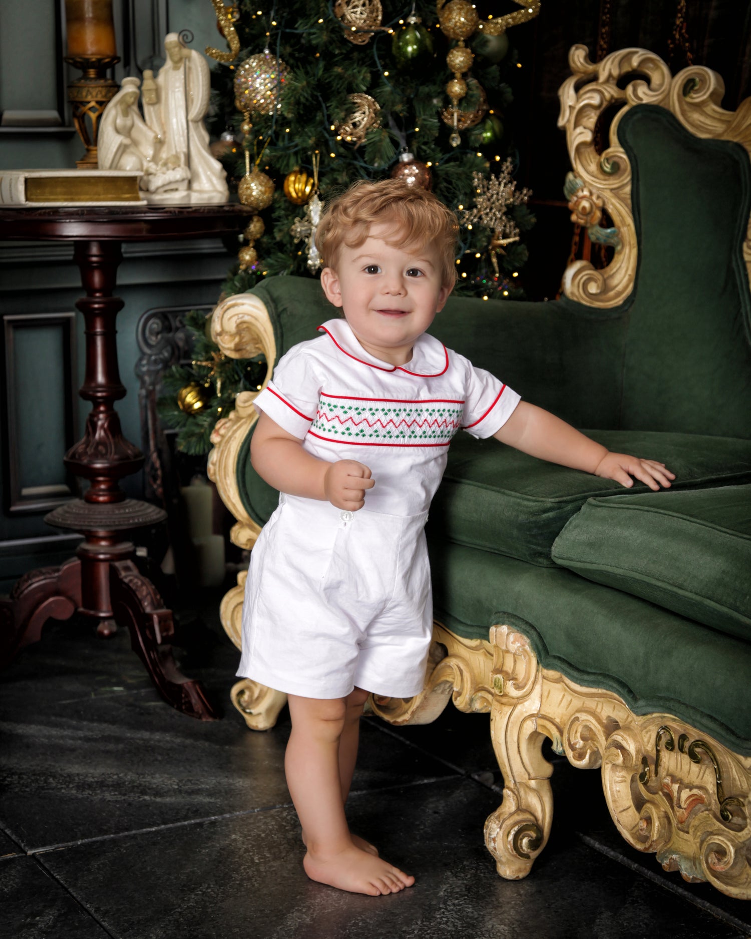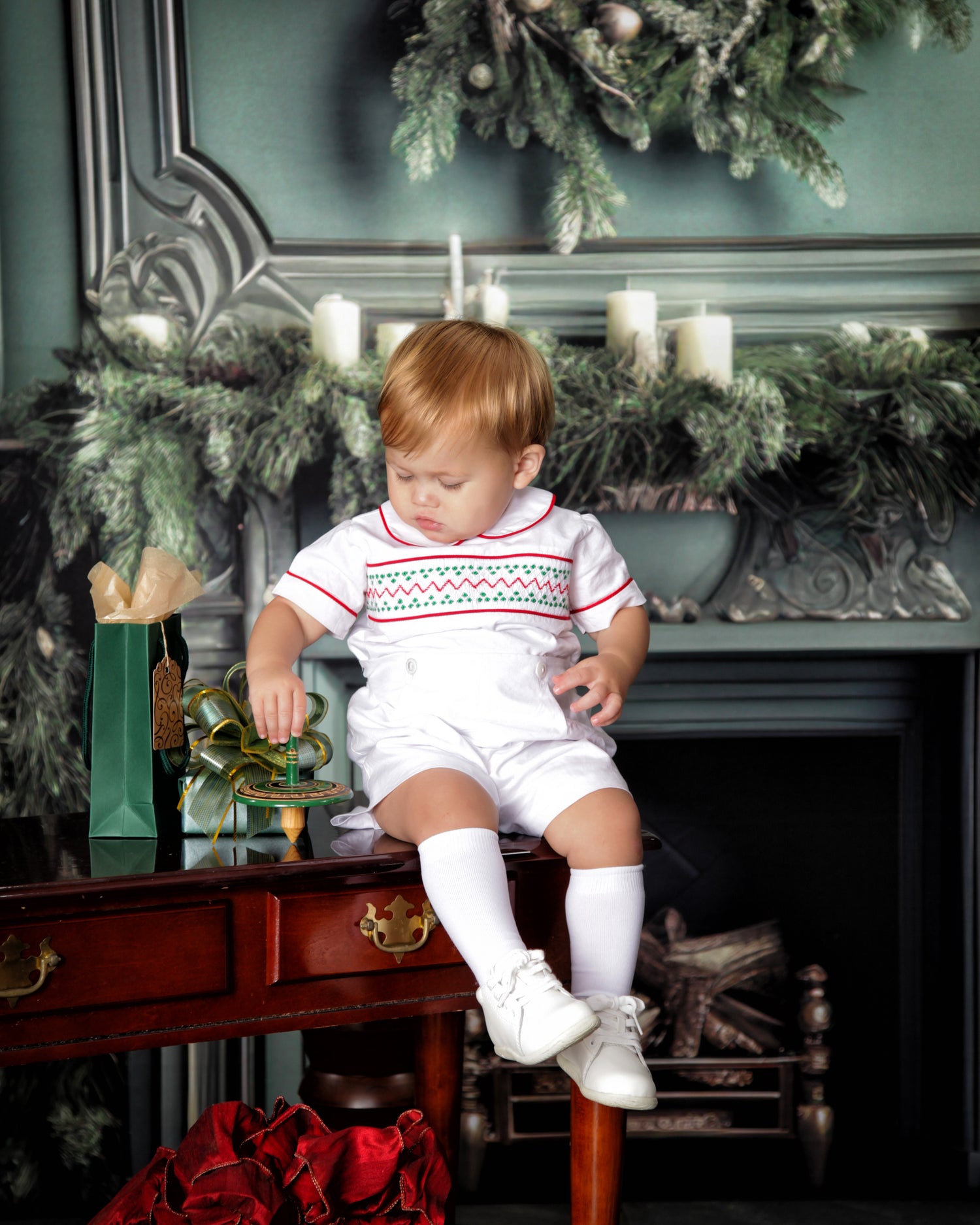 The charm of white on little ones for Christmas just got a bit sweeter with handcrafted smocking and embroidery added to our new boy’s button-on set. In soft 100% cotton with full lining, this set includes a short sleeve shirt with festive red, white, and green accents that attaches with fabric-covered buttons to the shorts in the front and back. The shirt buttons in the back with fabric-covered buttons as well. A charming addition to our collection, your little guy can coordinate with Ivy and Franny dresses for holiday portraits and celebrations.